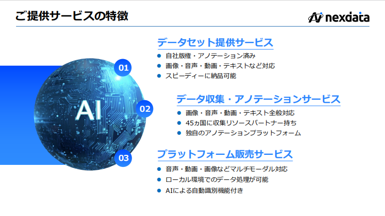 Nexdataは、日本最大級のAI学習データプロバイダーとして、2011年から画像・音声・テキスト・点群に対応可能な一貫したデータ提供・収集・アノテーションサービスを提供しています。現在1000社以上の導入実績があります。既製品データセット、カスタムデータ収集、高精度アノテーションサービスの3本柱で、お客様のAIプロジェクトを最速・最適な形で支援します。